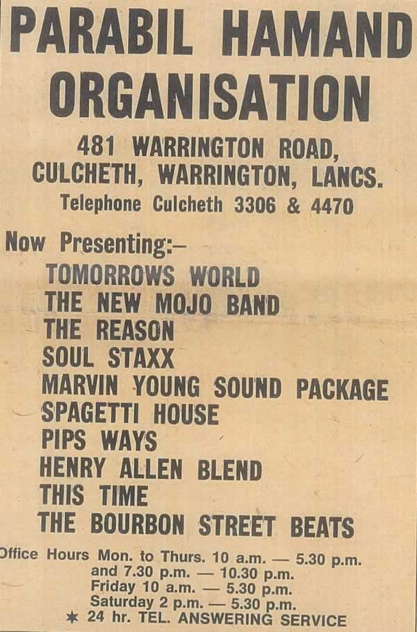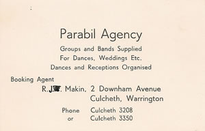 Our gig agent for Purple Gang 2....1971-----1973 Ray Makin.... in the main. But very proactive...got us lots of gigs but all under £50. Telephonist was always saying "He`s norrin"......which became a catchphrase for us later......"I`m norrin` -- go away !" I believe the name was gleaned form Pam Ray and Bill........happy but sometimes tough memories. best Chris Joe Beard/ Purple Gang