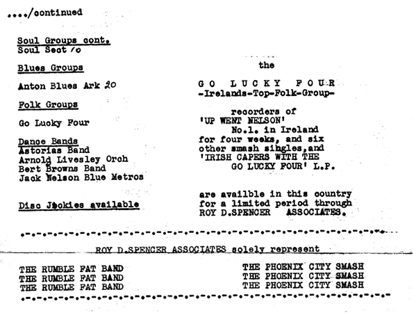RDSA also arranged the UK tour of a top Irish folk group of the time, The Go Lucky Four, who had a No 1 in Ireland with "Up Went Nelson".
