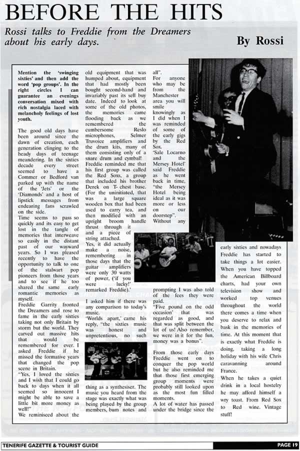 During the Skiffle era influenced by Lonnie Donegan (1931 - 2002), Freddie Garrity on a cheap guitar and his younger brother Derek Garrity on tea-chest bass formed in 1957 in the area in which they lived a band called The Red Sox (Skiffle Group), who played around the Manchester area and which lasted two years. In 1958 they were runners-up in a north-west Skiffle championship at The Locarno Ballroom, Washway Road, Sale. Subsequent bookings in and around Manchester at labour halls and cinema intermission kept them busy, but Garrity's fiancée Josie Tideswell (b. Josephine Ida Tideswell, 1943) prevailed upon him to leave the group to sing with the less demanding John Norman Four. Within weeks he had joined The Kingfishers. In Late 1959 they changed their name to The Dreamers who in March 1962 mutated into Freddie and the Dreamers.