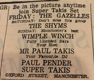 The Shyms were my first band. We did our first paid gig in 1964 - a wedding upstairs the Pack Horse pub in Wigan's Newtown area on Pemberton Road. There's an Aldi just opposite now and the pub's been demolished. We had a good night and then we told the audience: "That we had to finish playing after this song as we have catch the last bus home". That we put our modest gear, drums, amps aboard a Wigan Corporation bus to do the gig is unthinkable nowadays - but for the love of rock 'n roll and 5 quid - we did.