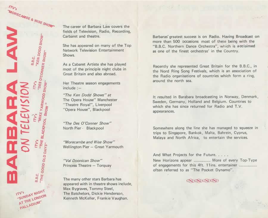 Barbara did many shows for TV with Morcambe and Wise, Des O’Connor, Ken Dodd and and has worked some fantastic venues - from the London Palladium to the Lake Side and topped the bill at many, many more.