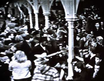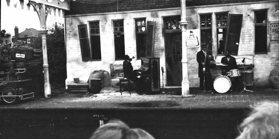 When the train pulled in to the station the passengers poured out of the train, passing Muddy Waters, who on the platform singing ’Blow Wind Blow’, then finding seating on the platform with audience members already seated.