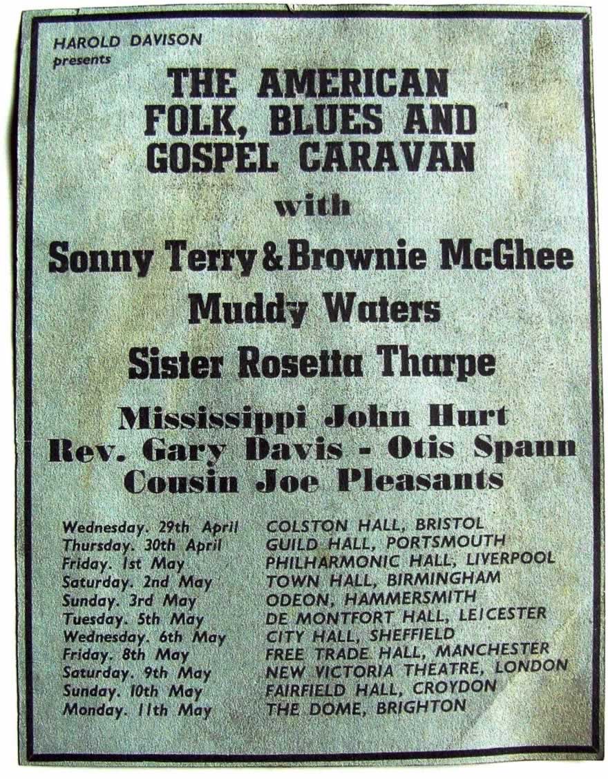 Filmed on May 7th 1964 and broadcast by Granada TV on 19th August 1964 at the height of the first British Blues boom‘Blues and Gospel Train’ was directed by Johnnie Hamp, it featured performances by Muddy Waters, Sonny Terry & Brownie McGee, Sister Rosetta Tharpe, and Cousin Joe Pleasant, who were touring Europe with the 1964 American Folk Blues and Gospel Caravan. Also on the bill but not appearing in the TV special was gospel singer Rev. Gary Davis. Promoted by Harold Davison the original tour poster advertised Mississippi John Hurt but he didn’t make it.