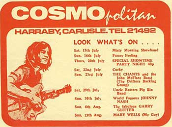 I remember going to the Cosmo Club in 1967 when learning to fly at Carlisle Airport. I was the first club I had ever been to - I was 18 at the time and still at school. On Sunday 2nd April '67 the Moody Blues were on the bill - a great night.
