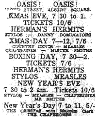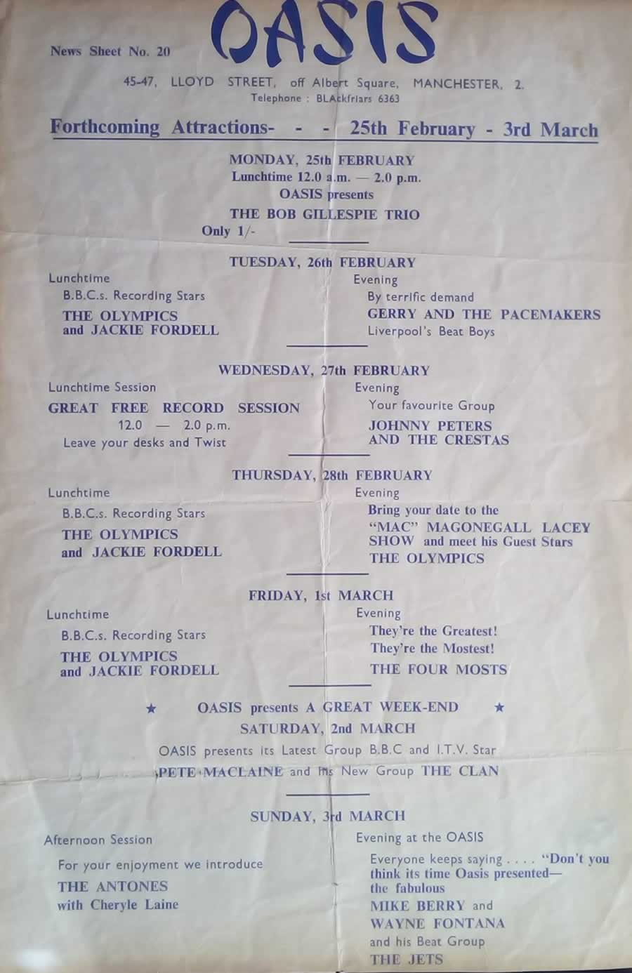 I remember Paul McCartney sitting on the small stage after the gig chatting to anybody and signing autographs. I think I got one but I don't recall what I did with it. The Oasis had a great informality about it and you could get up close and personal to the singers. Especially true on Tuesday nights when local favourites like the Olympics and Pete Maclaine and the Dakotas had the house spot.