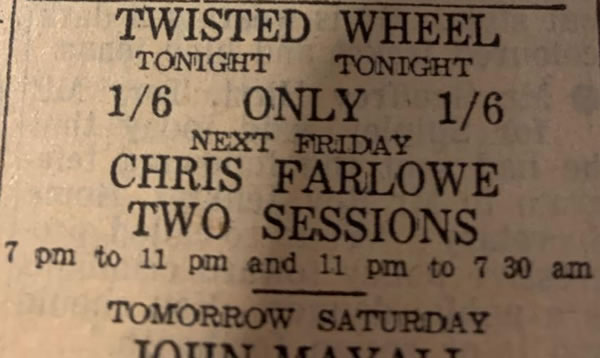 I first discovered the Twisted Wheel in 1962 when I started college in Manchester. I'd been to an all girls' grammar school in Stockport and going into Manchester every day was a huge excitement for me and the start of my new found freedom.
